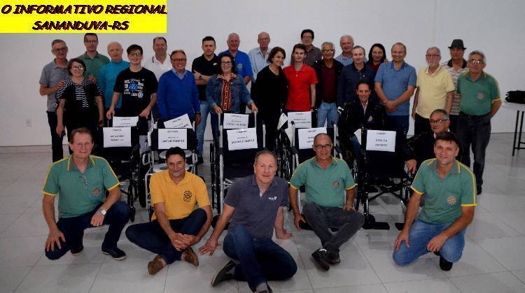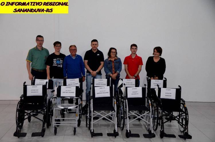 Em reunião realizada na noite de ontem o Rotary Clube Sananduva sob a presidência de Celso Bortolossi fez a entrega oficial ao Banco Ortopédico da entidade coordenado por Rodrigo Mezzomo de mais 7 cadeiras de rodas, 3 cadeiras de banho, 3 andadores, 4 pares de muletas, 4 bengalas e peças de reposição. Esses equipamentos foram adquiridos pelo Rotary Clube Sananduva com o lucro do Jantar Italiano recentemente realizado, somado as doações do Rataract, Casa da Amizade, Interact, Rotary Clube Vale do Inhandava e Rotary Kids que realizou a doação graças a uma campanha de arrecadação de 80 quilos de lacres de latinhas, foram 120 embalagens de 2 litros cheias de lacres.